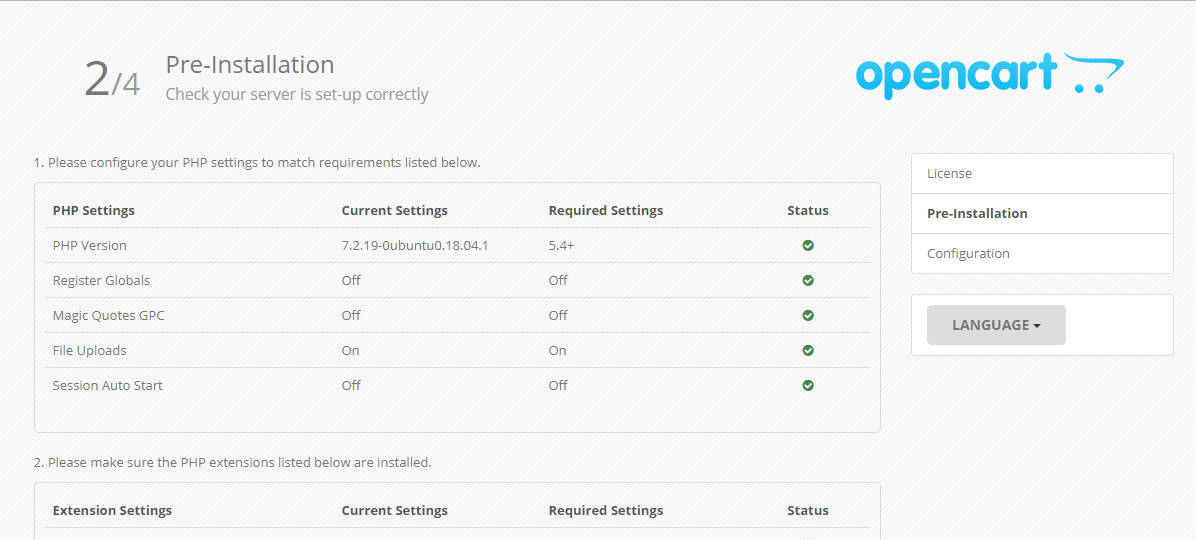The following page displays a list of pre-installation requirements that need to be met for successful installation of OpenCart. The last column displays the status of those requirements and shows if they are met or not.